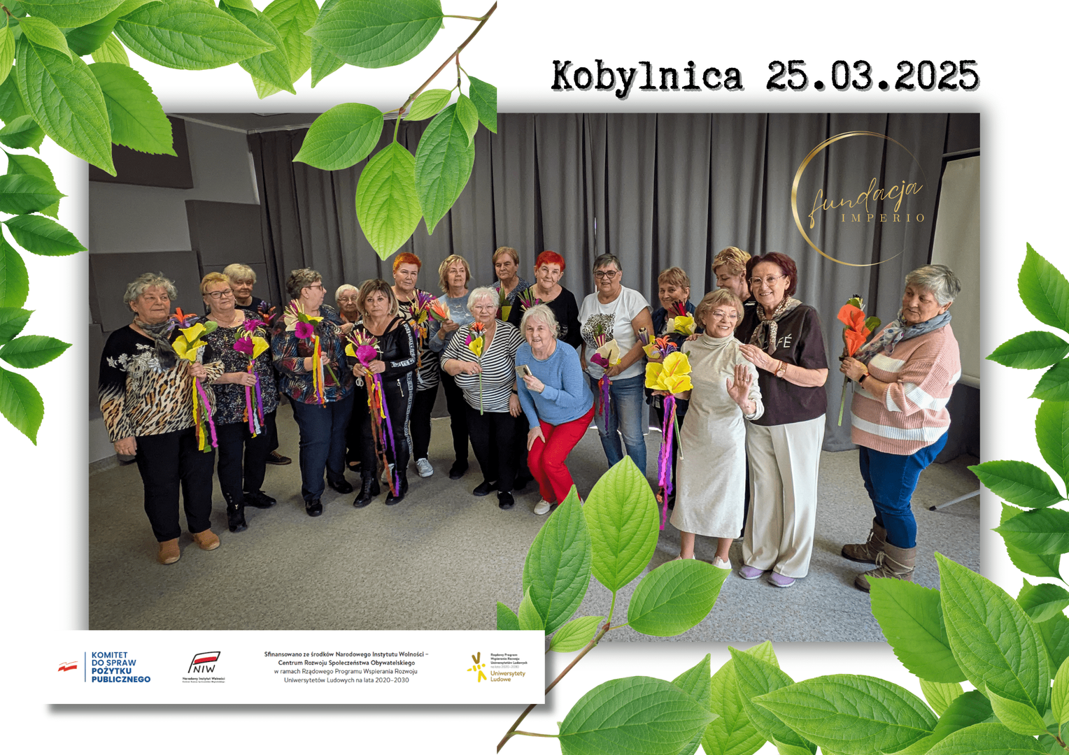 Spotkanie w Centrum Kultury i Promocji gminy Kobylnica było kolejnym etapem zadania realizowanego przez Fundację Imperio ze Słupska. Odwiedzamy każdą gminę powiatu słupskiego, by w gronie seniorów realizować ideę uczenia się przez całe życie. Wszyscy zgodnie uznali, że dla zdrowego i radosnego życia potrzebne są trzy filary: zdrowe odżywianie, aktywność fizyczna i pasja. I właśnie o tym trzecim filarze opowiadała Aleksandra Gałka-Proszowska. Prowadzone przez nią warsztaty zaowocowały pięknymi palmami na zbliżająca się Niedzielę Palmową.