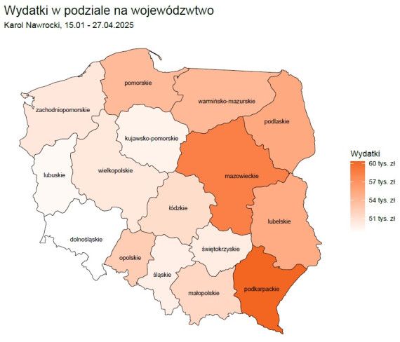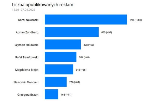 - Spośród 13 oficjalnych kandydatów 7 prowadzi aktywne kampanie reklamowe na platformach Meta (Facebook, Instagram) i Alphabet (Google, YouTube). Trzaskowski i Nawrocki zdecydowanie dominują pod względem wydatków i liczby reklam, przy czym ten ostatni pod koniec kwietnia opublikował blisko 1000 reklam, kierowanych głównie do osób powyżej 45. roku życia, z dużym udziałem seniorów oraz mężczyzn. Reklamy Nawrockiego były silnie targetowane regionalnie, zwłaszcza w województwach opolskim i podkarpackim.