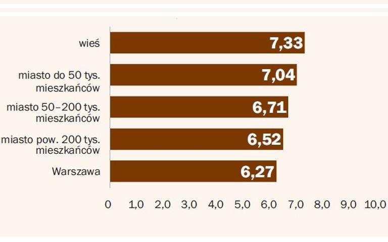 Najbardziej krytyczne wobec niej są stowarzyszenia i fundacje z Warszawy (6,27 pkt.) oraz innych wielkich miast (6,52 pkt.). Większy krytycyzm wobec jakości współpracy z lokalnym samorządem w dużych miastach może świadczyć o większych oczekiwaniach miejskich organizacji wobec urzędów.