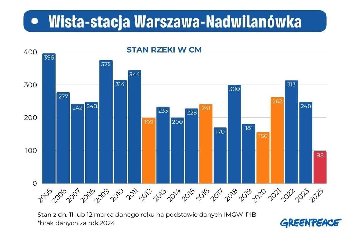 Rok 2024 był najcieplejszym w historii pomiarów, zima jest niezwykle sucha i bezśnieżna. Choć przedwiośnie kojarzy się nam z rozlewiskami, w tym roku rzeki mają rekordowo niski poziom wody. Eksperci alarmują, że już teraz w części kraju mamy suszę hydrologiczną. Greenpeace zebrał dane z marcowych pomiarów niektórych polskich rzek - tak źle nie było od lat. Zdjęcia satelitarne i dane IMGW-PIB pokazują w jak złej sytuacji jesteśmy.