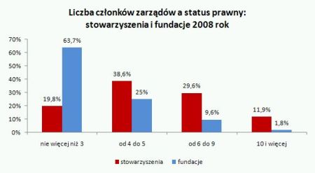 To, ile osób zasiada w zarządzie, określa statut. W większości organizacji (ok. 60%) liczba jego członków wynosi od 4 do 7 osób, co wydaje się być rezultatem kompromisu między poszanowaniem zasad demokracji i reprezentacji członków (przede wszystkim w przypadku stowarzyszeń), a efektywnością pracy i podejmowania decyzji. Co czwarta organizacja ma jednak zarząd liczący nie więcej niż 3 osoby, a w co dziesiątej zasiada w nim ponad 9 osób, przy czym zarządy małe charakterystyczne są przede wszystkim dla fundacji, zaś duże dla stowarzyszeń (szczegółowo obrazuje to poniższy wykres). Te dysproporcje w liczebności zarządów nie dziwią, jeśli wziąć pod uwagę różnice w sposobie wyboru i funkcji zarządu w stowarzyszeniach i fundacjach. W stowarzyszeniach zarządy są wybierane przez członków, a więc działają jako ich reprezentacja i choć nie jest to wymóg prawny, to z badań wynika, że ich liczebność związana jest z wielkością bazy członkowskiej. W stowarzyszeniach mających nie więcej niż 25 członków zarządy średnio liczą między 4 a 5 osób, tam, gdzie członków jest od 26 do 50 przeciętny zarząd składa się z 7 osób, zaś w tych stowarzyszeniach, w których zrzeszonych jest między 51 a 90 osób średnio zarząd jest ponad ośmioosobowy. W organizacjach o charakterze masowym – w których jest powyżej 500 członków (stanowią one ok. 5% wszystkich stowarzyszeń), przeciętny zarząd to ponad 11 osób.