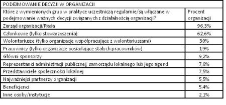 Zgodnie z polskim prawem sposób podejmowania najważniejszych decyzji zależy od formy prawnej organizacji. W stowarzyszeniach podejmują je członkowie, podczas tzw. walnego zebrania członków, choć zarząd, jako organ wykonawczy, na co dzień rozstrzyga o różnego rodzaju kwestiach operacyjnych. Z kolei w fundacjach to zarząd decyduje o wszystkich istotnych kwestiach. Jednak niezależnie od formy prawnej, dobrą praktyką w organizacjach jest takie organizowanie procesów decyzyjnych (oczywiście nie wszystkich, ale np. tych związanych z wyznaczaniem kierunków rozwoju organizacji), aby mogli w nich uczestniczyć najważniejsi interesariusze. Niestety, wyniki badania wskazują jednoznacznie, że dominujący styl zarządzania w organizacjach zdecydowanie trudno nazwać partycypacyjnym. Nawet członkowie uczestniczą regularnie w podejmowaniu ważnych decyzji tylko w ok. 60% stowarzyszeń. Wolontariusze są pytani o zdanie w 30% organizacji, które z nimi współpracują, pracownicy tylko w 19%. Mniej niż 10% organizacji twierdzi, że regularnie włącza w podejmowanie ważnych decyzji sponsorów, reprezentantów administracji lub samorządu, przedstawicieli społeczności lokalnych czy najważniejszych sponsorów, ale to, co najbardziej symptomatyczne, to udział (a raczej jego brak) głosu beneficjentów – tylko 5% uwzględnia go przy podejmowaniu ważnych decyzji (szczegóły w tabeli poniżej).