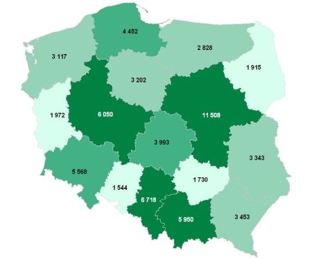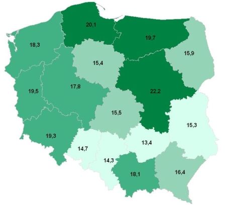 kraju, zaś najwięcej – na zachodzie. Różnice stają się bardziej
