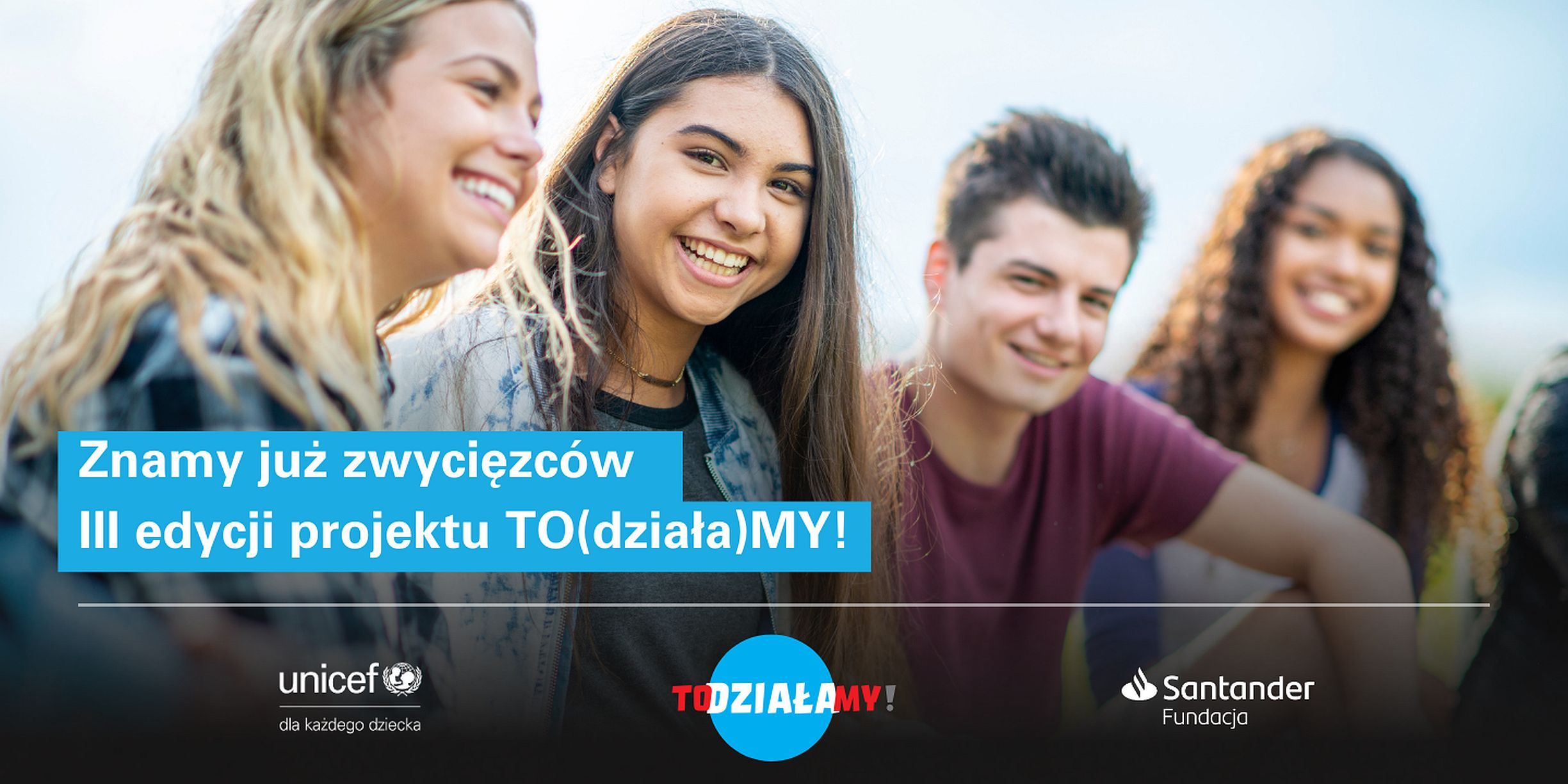 Projekt grantowy TO(działa)MY!, przygotowany wspólnie przez UNICEF Polska i Fundację Santander Bank Polska, ma za zadanie wyrabiać w dzieciach i młodzieży chęci oraz umiejętności zaangażowania społecznego. Już po raz trzeci w ten sposób zwracamy uwagę młodego pokolenia na potrzeby ich najbliższego otoczenia, poszerzamy świadomość w obszarach związanych z ekologią, środowiskiem, edukacją, kulturą i rozrywką oraz motywujemy ich do podejmowania aktywności.