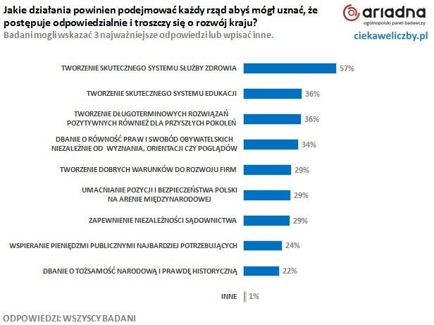 Badani Polacy w odpowiedzi na pytanie „Jakie działania powinien podejmować każdy rząd, abyś mógł uznać, że postępuje odpowiedzialnie i troszczy się o rozwój kraju?” najczęściej zaznaczali odpowiedzi: tworzenie skutecznego systemu zdrowia (57%), tworzenie skutecznego systemu edukacji (36%) oraz patrzenie perspektywiczne, czyli tworzenie długoterminowych rozwiązań, pozytywnych również dla przyszłych pokoleń (36%).