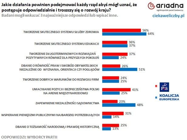 Tworzenie skutecznego systemu służby zdrowia zostało wskazane jako najważniejsze odpowiedzialne działanie rządzących zarówno przez wyborców Prawa i Sprawiedliwości (56%), jak i Koalicji Europejskiej (64%). Zgodnie również umieścili na 4. miejscu w hierarchii ważności tworzenie skutecznego sytemu edukacji (36% vs. 37%).