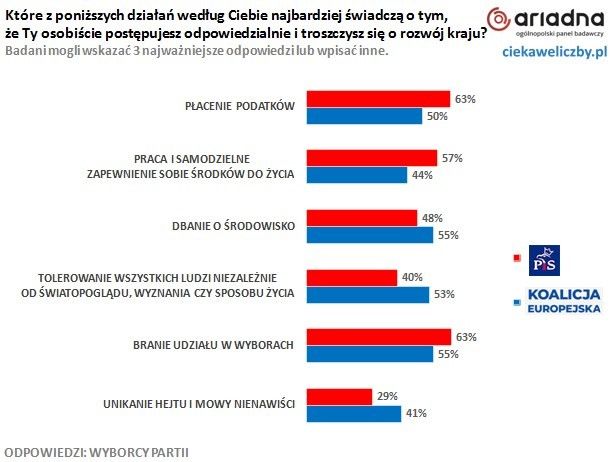 Na podium odpowiedzialnych działań wśród elektoratu PiS znalazło się jeszcze: płacenie podatków (63%) oraz praca i samodzielne zapewnienie sobie środków do życia (57%), natomiast wśród wyborców KE: dbanie o środowisko (55%) oraz tolerowanie wszystkich ludzi niezależnie od światopoglądu, wyznania czy sposobu życia (53%).