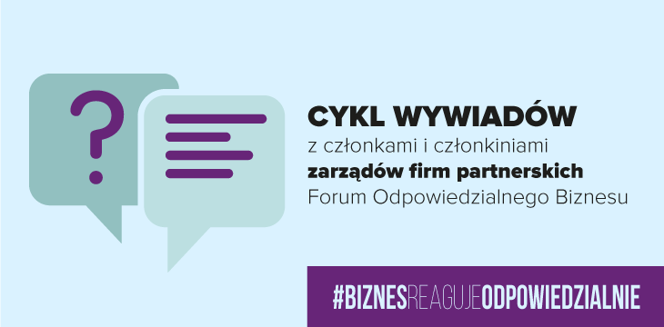 To druga odsłona cyklu wywiadów z CEOs firm partnerskich Forum Odpowiedzialnego Biznesu. Celem inicjatywy jest zaprezentowanie wyzwań, przed którymi stoją organizacje, oraz ukazanie podjętych rozwiązań i działań pomocowych w czasie pandemii koronawirusa SARS-CoV-2. Rozmowy powstały w ramach akcji #BiznesReagujeOdpowiedzialnie, przedstawiającej odpowiedź biznesu na zaistniały kryzys, w tym szereg pozytywnych przykładów zaangażowania firm.