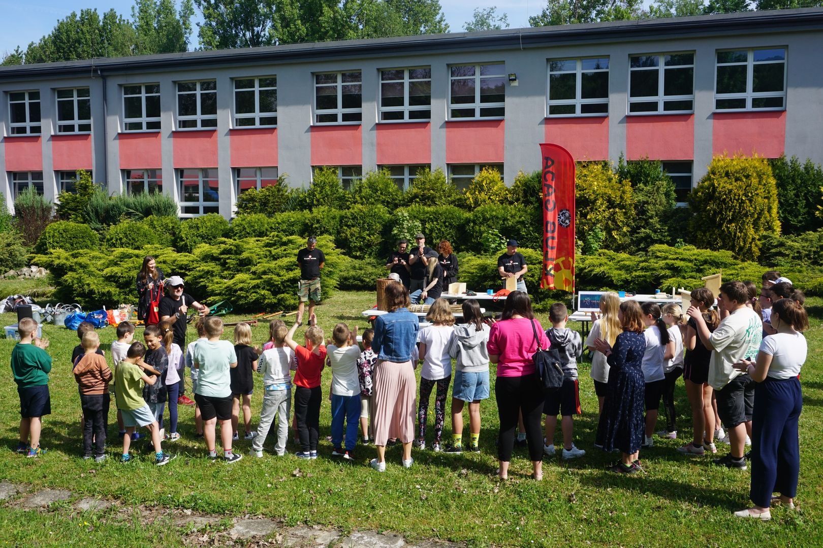 W poniedziałek 6 maja, dzieci i młodzież ze wszystkich klas (115 osób) wzięli udział w wydarzeniu edukacyjnym Klub Gaja „Święto Drzewa – ogrody dla przyrody”. Już od rana zaczęła się wspólna praca Ziemi. Podczas różnych warsztatów edukatorki i edukatorzy Klubu Gaja pracowali z kolejnymi grupami uczennic i uczniów. Podczas zajęć wspólnie posadzono 50 drzew, krzewów i pnączy m.in. jabłonie, śliwy, grusze, derenie, lilaki, bzy czarne, leszczyny, porzeczki czarne i czerwone, rokitniki, powojniki. W ogrodzie deszczowym pracowano z zapałem i posadzono 170 roślin podmokłych łąk. Plan nasadzeń obejmował gatunki roślin, które znoszą okresowe zalewanie, ale i przesuszenie, jak np. turzyce, bodziszki, irysy, jaskry. Na zakończenie ogród deszczowy wyściółkowano żwirem. Na rabacie przed szkołą posadzono 124 bylin m.in. bergenie, szałwie, kocimiętki, bodziszki. Obok na skwerze zamontowano trzy domki dla dzikich zapylaczy. Na stanowiskach budowy różnych schronień dla dzikich zwierząt wspólnie z uczestnikami wydarzenia zbudowano także 2 budki lęgowe dla wiewiórek, 2 budki lęgowe dla małych ptaków typu A i 2 budki dla dużych ptaków typu B, które zamontowano na terenie ogrodu.