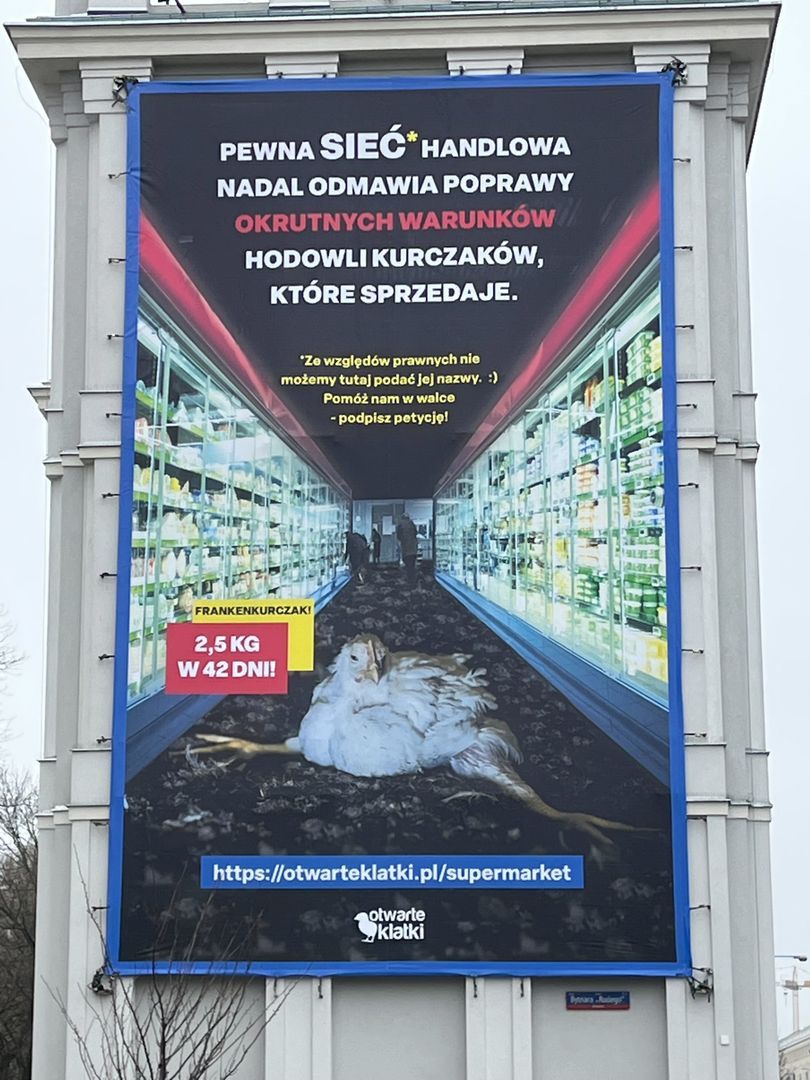 Na budynku przy Al. Niepodległości 107/109 zawisł gigantyczny billboard pokazujący cierpiącego kurczaka pośród sklepowych półek – będzie tam do końca grudnia. Jest to część kampanii Stowarzyszenia Otwarte Klatki, której celem jest przekonanie sieci Lidl do zwiększenia wymagań, jakie stawia swoim dostawcom mięsa drobiowego.