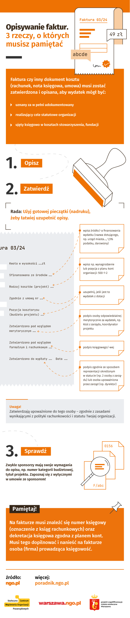 Jak opisywać faktury? W organizacjach pozarządowych może to być dość skomplikowane. Zbieramy na infografice podstawowe informacje, które pomogą Wam w odpowiedni sposób opisać większość faktur i innych dokumentów. Skorzystajcie!
