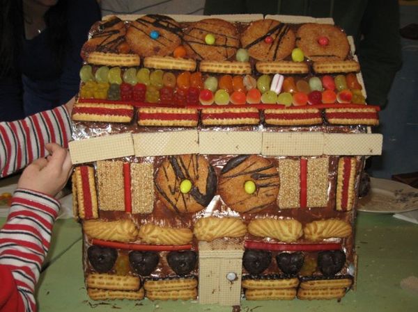 Za to właśnie panowie celowali w zdobniczych pomysłach w czasie innych zajęć. Inżynieryjne zacięcie ujawniło się przy planowaniu i konstrukcji domku przygotowanego w ramach zajęć kulinarnych. Forma tej słodkiej budowli wykonana była z kartonu owiniętego folią spożywczą. Następnie czas na zaprawę, pyszną zresztą, bo z nutelli.