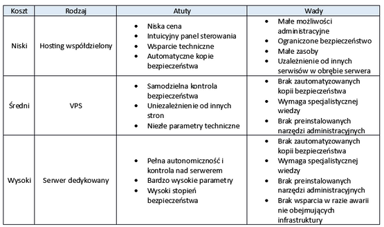 Usługa udostępnienia przestrzeni serwerowej zazwyczaj jest oferowana w trzech wariantach. Wybór odpowiedniego zależy od ilości zasobów przechowywanych w sieci, oczekiwanego sposobu ich zabezpieczenia oraz wymogów w zakresie dostępu do narzędzi administratorskich. Omówienie podstawowych usług prezentujemy w tabeli poniżej.