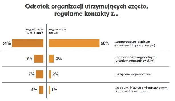Wiele organizacji pozarządowych działa lokalnie, dlatego ich naturalnym partnerem jest lokalny samorząd (urzędy miast i gmin oraz starostwa powiatowe). Świadczy o tym intensywność kontaktów: ma je ponad 80% organizacji, ponad 30% określa je jako częste i regularne. Z urzędami marszałkowskimi i administracją rządową organizacje współpracują znacznie rzadziej – częste, regularne kontakty ma zaledwie kilka procent organizacji. Prawie dwie trzecie w ogóle nie kontaktuje się z urzędami wojewódzkimi, a aż trzy czwarte nie ma żadnych kontaktów z rządowymi instytucjami na szczeblu centralnym. Relacje z administracją publiczną w ogromnym stopniu zależą od miejsca w jakim stowarzyszenia i fundacje działają. Współpraca z samorządem lokalnym jest kluczowa dla organizacji wiejskich: kontakty z urzędami gminy lub powiatu podtrzymuje 95% z nich, zaś 50% deklaruje, że są one częste i regularne. W miastach odsetki te są na poziomie 79% i 31%.