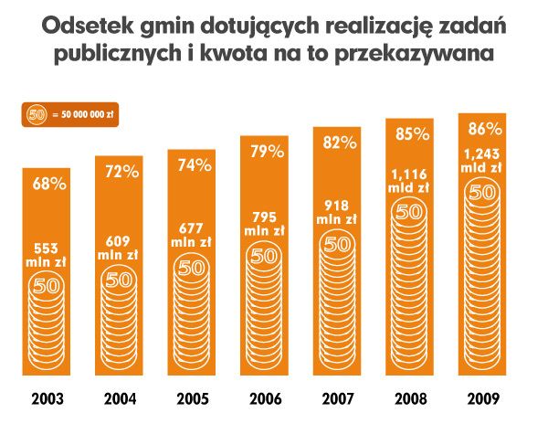 Jednocześnie prawie nie ma miast, które nie zlecałyby realizacji zadań publicznych organizacjom, natomiast 20% gmin wiejskich nie przekazuje im żadnych środków. Różnice dotyczą nie tylko finansów: podobnie ma się rzecz z uchwalaniem wymaganych ustawą o działalności pożytku publicznego i o wolontariacie programów współpracy (zaniedbuje je co piąta gmina wiejska) czy ich konsultowaniem (przeprowadzane w 80% miast i zaledwie w połowie uchwalających programy gmin wiejskich). Łączna kwota środków przekazanych przez gminy organizacjom wyniosła w 2009 roku ponad 1 miliard 200 mln zł, przy czym 59% tej sumy to wydatki miast na prawach powiatu.