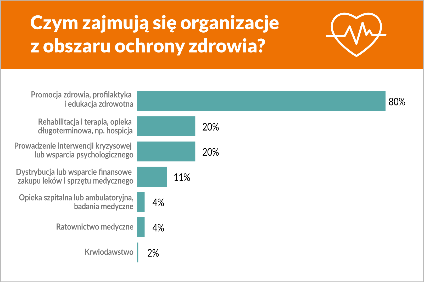 Jednak organizacje nie tylko starają się przeciwdziałać chorobom, ale też pomagają tym, którzy mają problemy zdrowotne. Są zaangażowane w organizowanie rehabilitacji lub opieki długoterminowej (mniej więcej co trzecie hospicjum w Polsce jest prowadzone przez organizację pozarządową); prowadzą interwencję kryzysową i wsparcie psychologiczne. Nieliczne, wyspecjalizowane organizacje świadczą opiekę szpitalną lub ambulatoryjną, prowadzą badania medyczne, zajmują się ratownictwem medycznym i krwiodawstwem.