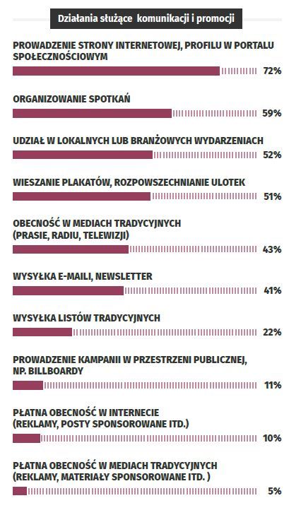 Organizacje zdają sobie sprawę, że o swojej aktywności powinny informować otoczenie – praktycznie wszystkie podejmują działania służące komunikacji ze światem zewnętrznym. Najczęściej korzystają przy tym ze strony internetowej lub profilu w mediach społecznościowych (72% wybiera taką formę komunikacji).