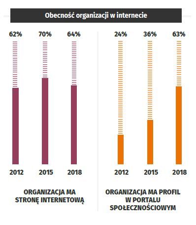 W ostatnich latach intensywnie rośnie odsetek organizacji, które prowadzą profil w mediach społecznościowych, podczas gdy procent stowarzyszeń i fundacji posiadających stronę internetową praktycznie się nie zmienia (a nawet nieco spadł między 2015 a 2018 rokiem). Jeszcze w 2012 roku procent organizacji posiadających stronę internetową był ponad dwa razy wyższy niż odsetek stowarzyszeń i fundacji obecnych w mediach społecznościowych. W 2018 roku poziom ten się wyrównał: stronę internetową ma 64%, a profil w mediach społecznościowych 63% organizacji.