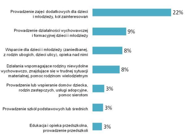 Praca organizacji z dziećmi i na ich rzecz jest zazwyczaj częścią działalności edukacyjnej i wychowawczej. 22% spośród wszystkich fundacji i stowarzyszeń w Polsce prowadzi zajęcia dodatkowe dla dzieci i młodzieży, np. w formie kół zainteresowań. Prawie co dziesiąta organizacja pozarządowa (9%) deklaruje prowadzenie działalności wychowawczej i formacyjnej, np. organizuje obozy harcerskie. Po 3% organizacji prowadzi szkoły podstawowe lub średnie i przedszkola.