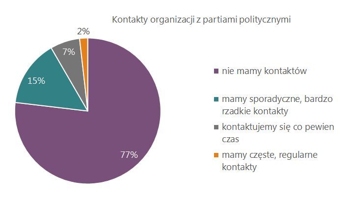 Ponad ¾ organizacji nie podejmuje żadnych kontaktów z partiami politycznymi, mimo że nie oznaczają one automatycznie zaangażowania w politykę (a na przykład mogą być elementem działań rzeczniczych).