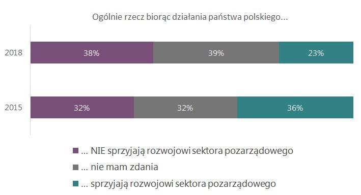 Można się zastanawiać, czy krytyka pod adresem rządu jest stałą postawą organizacji, czy ma ona związek z konkretnym gabinetem czy opcją polityczną. Pewną odpowiedzią na to pytanie będzie zestawienie odpowiedzi udzielonych w 2015 i 2018 roku na pytanie, czy organizacje zgadzają się ze zdaniem „Ogólnie rzecz biorąc działania państwa polskiego sprzyjają w Polsce rozwojowi sektora pozarządowego”. W 2015 roku zgodziło się z nim 36% sektora, a w 2018 roku 23%, czyli o 13 punktów procentowych mniej. Nie znaczy to jednak, że w 2015 roku nie było organizacji, które nie zgadzały się z tą tezą: 32% uważało, że działania państwa nie sprzyjają rozwojowi sektora. W 2018 roku było ich jednak więcej: 38%.
