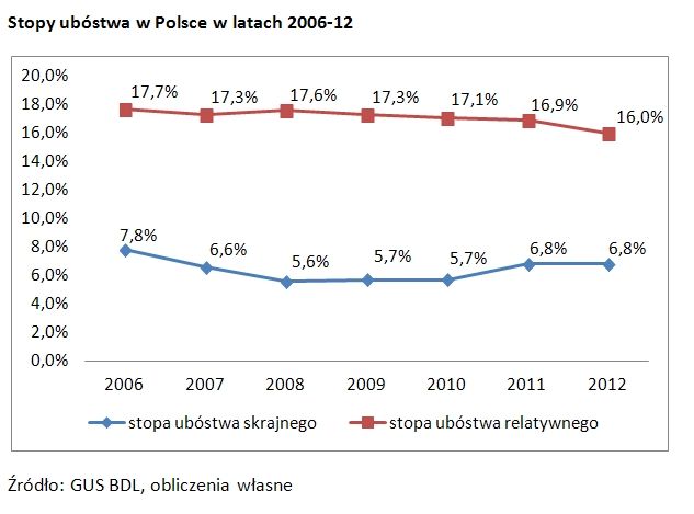 Szeroko pojęta sfera niedostatku w Polsce kurczy się, jednak nie dotyczy to ubóstwa skrajnego. W ostatnim pięcioleciu stopa skrajnego ubóstwa, liczona na podstawie minimum egzystencji, utrzymuje się na zbliżonym poziomie (5-7%). Poza tym zmniejsza się liczba osób relatywnie ubogich (tj. takich, które mają do dyspozycji poniżej 50% przeciętnych wydatków gospodarstw domowych). Nie jest to jednak całkiem optymistyczny obraz – od 2011 roku obniża się również poziom wydatków ogółu gospodarstw domowych. Oznacza to, że mamy mniej w portfelu i mniej możemy wydać.