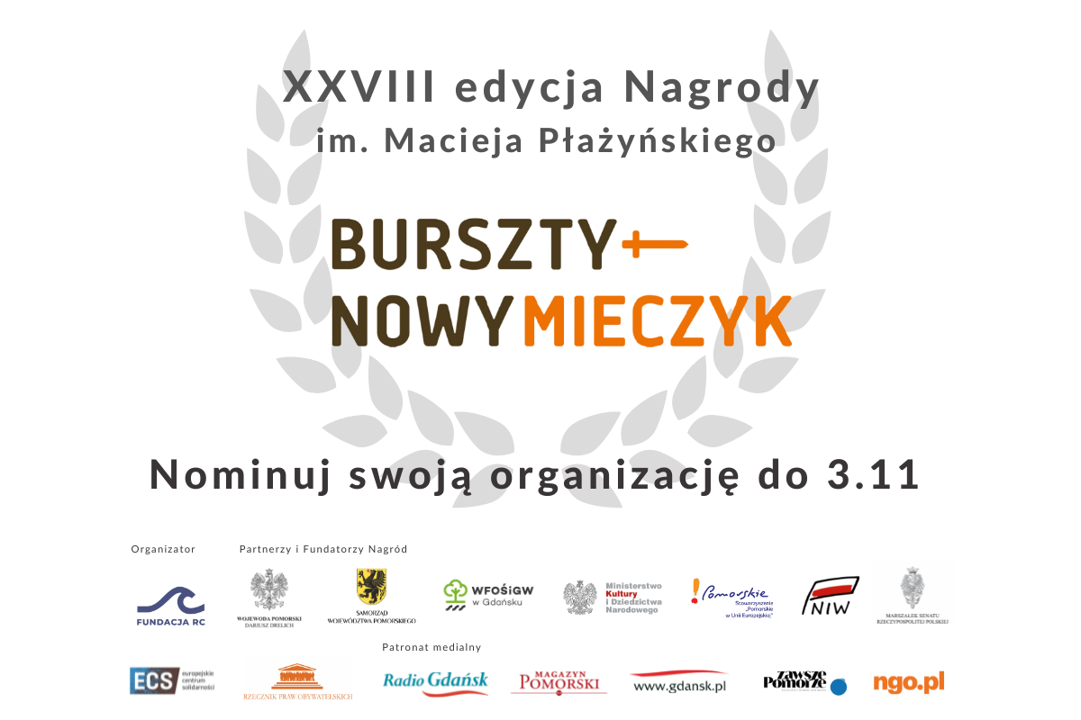 Fundacja RC do 03.11.2022 czeka na zgłoszenia do konkursu o Nagrodę Bursztynowego Mieczyka im. Macieja Płażyńskiego. To już 28. edycja inicjatywy skierowanej do pomorskich organizacji społecznych. W konkursie przewidziano 10 nagród finansowych lub rzeczowych w różnych kategoriach.