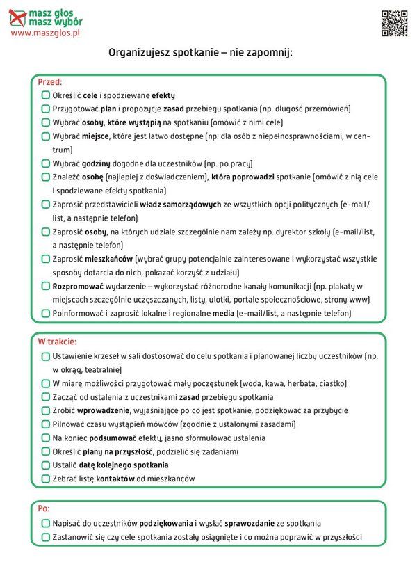 Poniżej prezentujemy krótką listę o czym nie zapomnieć organizując spotkanie (format pdf i jpg), nie tylko w ramach akcji Masz Głos, Masz Wybór!