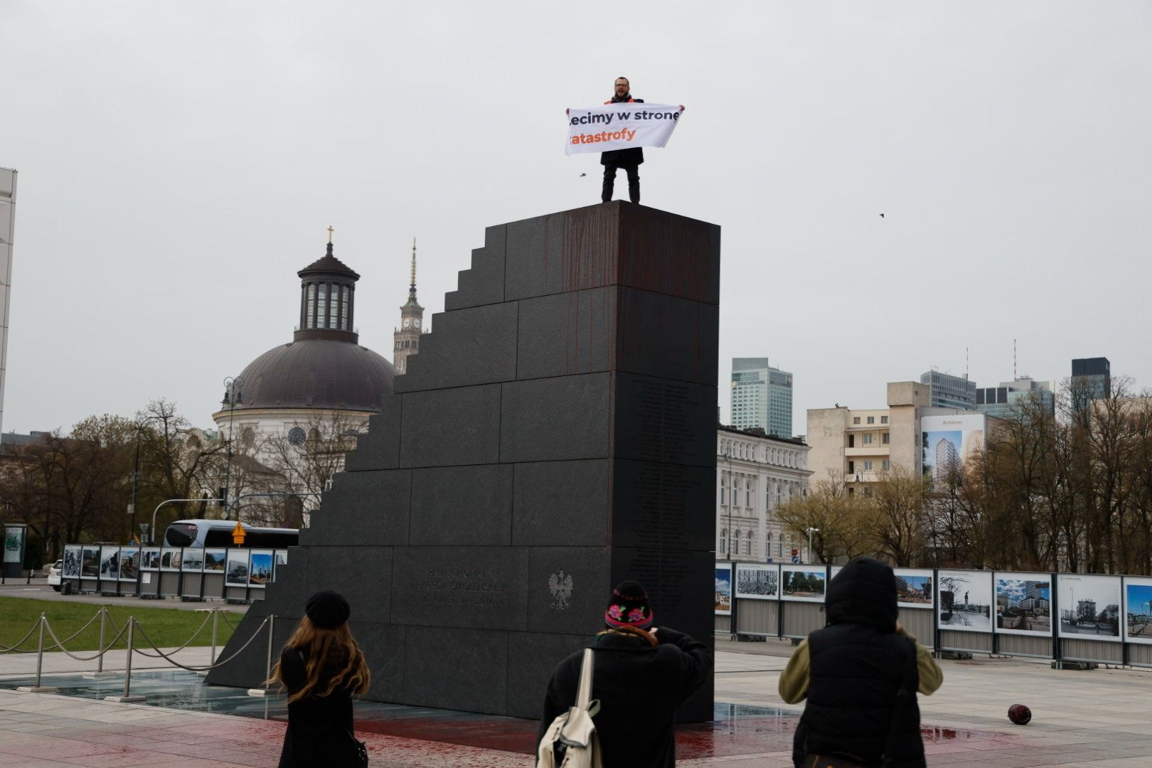 Ostatnie Pokolenie wylało sztuczną krew na Schody Smoleńskie w przeddzień 15. rocznicy Katastrofy. Teraz 35-letni Przemek Siewior stoi na pomniku z banerem „lecimy w stronę katastrofy”.