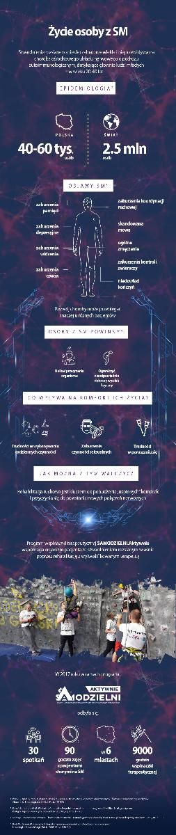 Pomysł programu wspinaczki terapeutycznej jest kompleksową odpowiedzią na potrzeby pacjentów ze stwardnieniem rozsianym. Oddziałuje na warunki: fizyczne; poznawcze, takie jak koncentracja czy uwaga; społeczne - nowa grupa wspierających się pasjonatów wraz z przyjaciółmi i rodzinami oraz psychiczno-emocjonalne, np. indywidualne wyzwanie, ukazujące świadomość swoich nowych możliwości. Wspinaczka jest formą treningu stacyjnego, która odbywa się poza murami szpitalnych oddziałów neurologicznych i rehabilitacyjnych, co pozwala zapomnieć o ograniczeniach wynikających z choroby. Wspinanie się jest podstawowym wzorcem ruchowym dla całego ciała, wzmacnia poczucie równowagi, odczuwanie własnego ciała w przestrzeni, poprawia koordynację ruchową, zwiększa wytrzymałość i siłę mięśni oraz stabilność tułowia. Wspinaczka terapeutyczna to indywidualne, dopasowane do każdego pacjenta odtwarzanie funkcjonalnych wzorców ruchowych angażujących duże zespoły mięśniowe, które pozwalają działać zgodnie z mottem warsztatów: „Im większa przeszkoda, tym większa chwała w pokonywaniu jej” – wyjaśnia ekspert programu „SAMODZIELNI. Aktywnie”, fizjoterapeuta Ewa Świątek ze Szpitala im. Kopernika w Łodzi. Rehabilitacja inaczej Osoby z SM w ciągu swojego życia doświadczają różnych trudności odczuwanych w życiu społecznym, zawodowym, rodzinnym czy seksualnym.