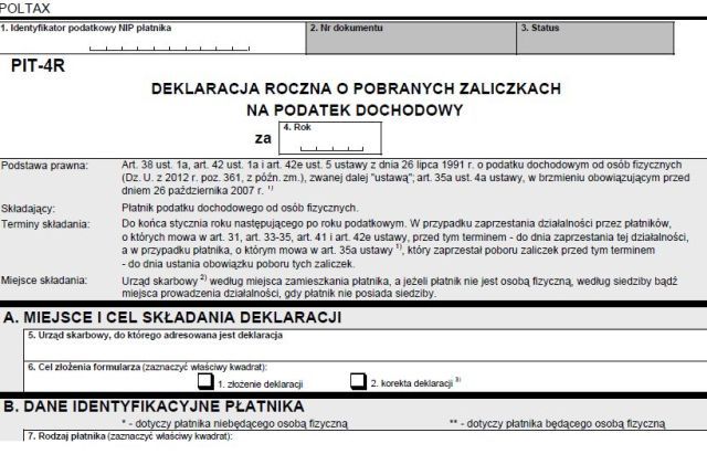 Organizacja, która zatrudniała w 2013 r. osoby na umowy: o pracę, dzieło lub na zlecenie, musi złożyć do urzędu skarbowego, na formularzu PIT-4R, rozliczenie zaliczek na podatek dochodowy od osób fizycznych (PDOF), które były płacone w ciągu całego roku. Organizacja wylicza w nim zapłacony podatek w podziale na różne typy zatrudnienia.