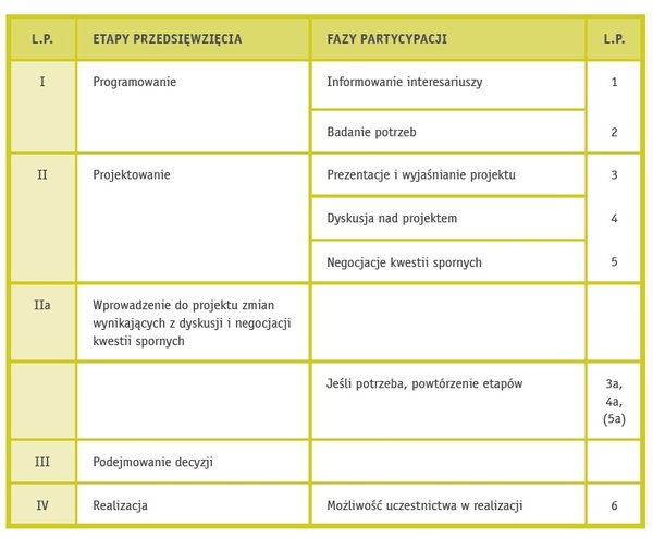 Proces partycypacji społecznej nie powinien poprzedzać procesu decyzyjnego ani być jego skutkiem. Powinien mu towarzyszyć. Przedsięwzięcie można podzielić na cztery etapy: programowanie, projektowanie, podejmowanie decyzji, realizacja. Towarzyszy im sześć faz partycypacji: