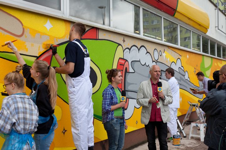 - Choć z początku Toruń przywitał nas deszczową pogodą, jak na zamówienie, o godzinie 10.00 niebo rozpogodziło się i można było przystąpić do malowania. To już ponad 20 malowanie, kiedy dopisała nam doskonała aura - mówi Piotr Cywiński, przedstawiciel marki Dulux. Od początku duże zaangażowanie ze strony mieszkańców, sprawiło, że połączonymi siłami do 13.00 udało nam się skończyć cały projekt. Do przygotowania budynku przeznaczyliśmy ponad 130 litrów na jedną warstwę. W sumie zużyliśmy prawie 400 litrów kolorowych farb na trzy warstwy, którymi został pokryty pawilon – dodaje.