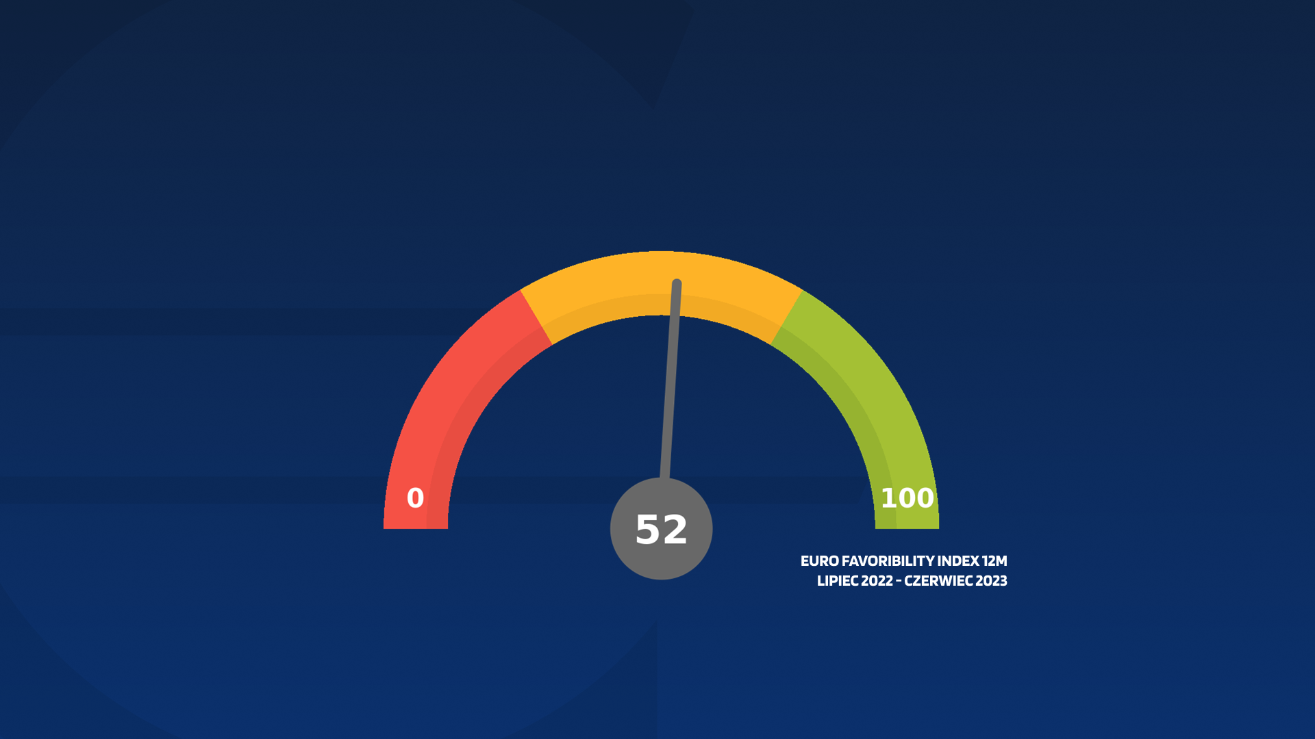 Autorski wskaźnik „Indeks Eurosentymentu” (Euro Favorability Index 12M), mierzący zaangażowanie internautów w ostatnich 12 miesiącach, spadł względem poprzedniego raportu aż o 13 punktów procentowych i przyjął wartość 52. Wciąż nieznacznie przechyla się on na stronę „za” wprowadzeniem euro, jednak od początku roku widoczna jest tendencja spadkowa.