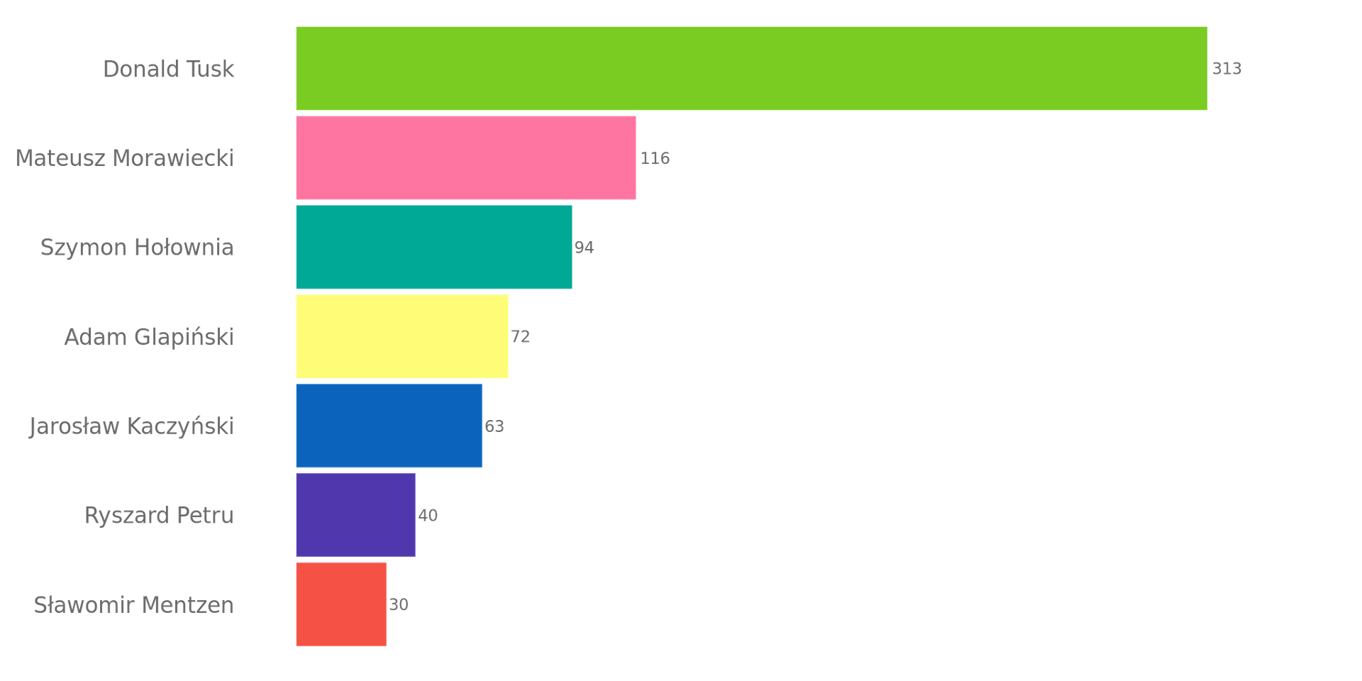Także wypowiedzi dotyczące pierwszoplanowych polityków: Szymona Hołowni, Mateusza Morawieckiego i Donalda Tuska generowały w ostatnim kwartale dyskusję o euro w Polsce. Najwięcej w kontekście euro pisano o liderze Platformy Obywatelskiej, prawie trzykrotnie więcej niż o premierze Morawieckim. Co ciekawe, lider Polski 2050 wzbudził za to największe zaangażowanie w temacie euro na samym portalu Facebook.