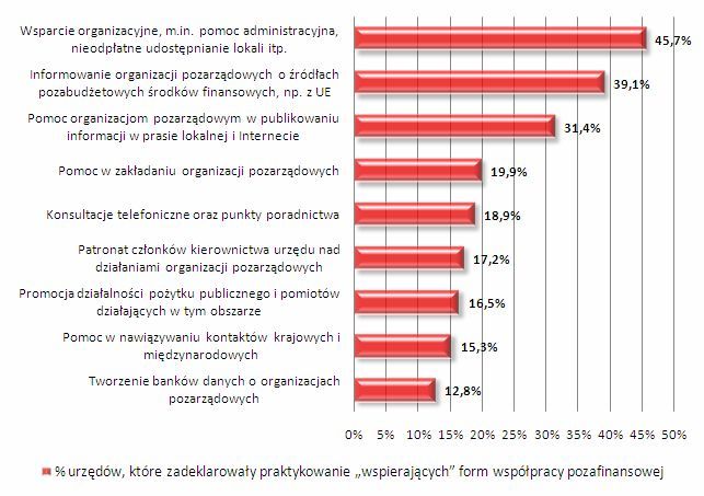 Oceniając wspierające formy współpracy pozafinansowej, przyglądano się czy w danej jednostce samorządu terytorialnego działają formy współpracy pozafinansowej, które można określić jako „opiekuńcze” czy też „wspierające”. Chodziło o takie działania, w których strony nie są partnerami, ale jedna jest wyraźnie beneficjentem drugiej, tzn. urzędy udzielają pomocy, wsparcia organizacjom.