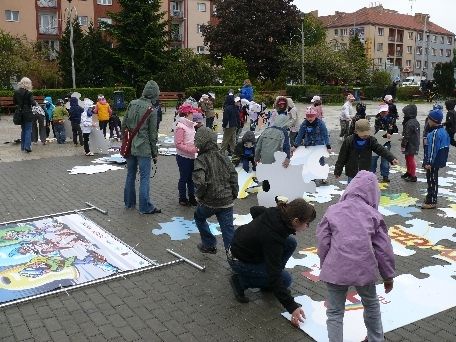 O godzinie 12.00, na Rynku w Cieszynie oraz Kędzierzynie-Koźlu dzieci układają ogromne puzzli, które po ułożeniu tworzą barwny obraz wymiarach 5 x 5 metrów. W akcji cieszyńskiej uczestniczyli uczniowie Alternatywnej Szkoły Podstawowej, a w Kędzierzynie-Koźlu udział wezmą dzieci ze Publicznej Szkoły Podstawowej nr 12. Całe wydarzenie trwa ok. 45 min. i jest połączone z konferencją prasową.