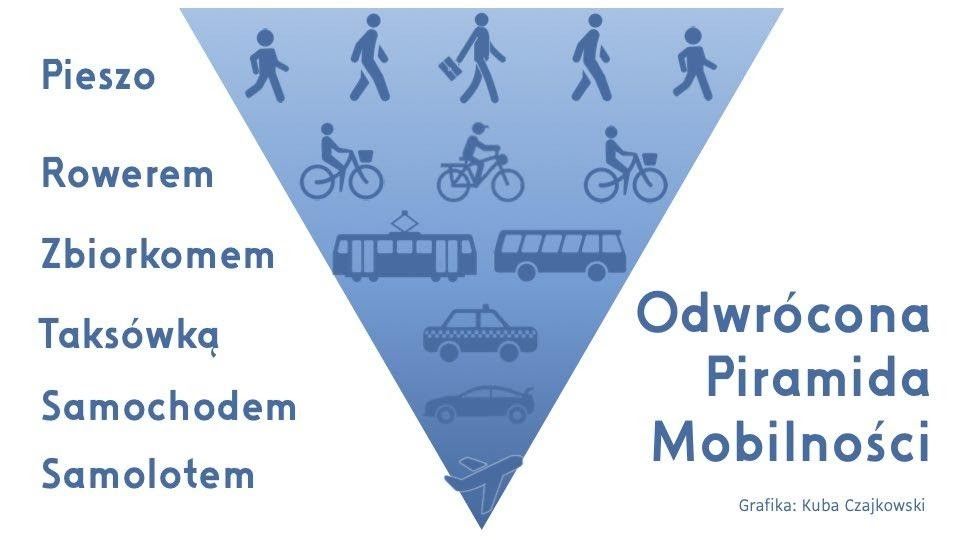 Przemieszczanie się pieszo czy rowerem jest w stu procentach bezemisyjne. Dlatego to właśnie ruch pieszy i rowerowy powinien stanowić podstawę naszej mobilności. Doskonale pokazuje to tzw. odwrócona piramida mobilności zaprezentowana w 2011 r. przez kopenhaskie stowarzyszenie Bicycle Innovation Lab.