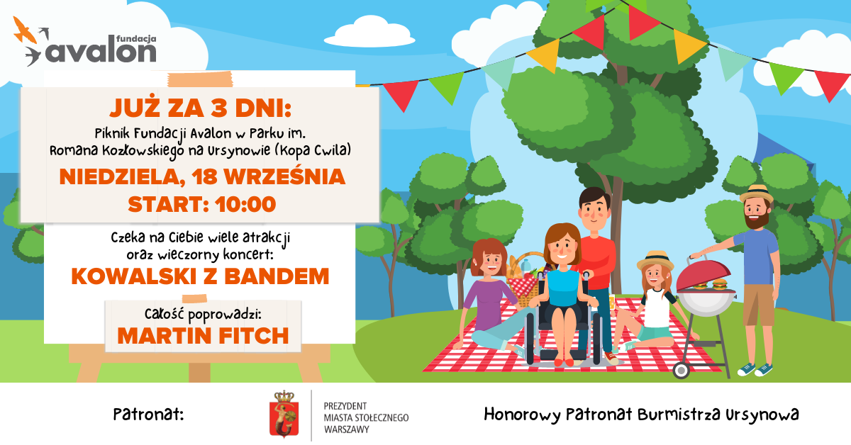 Jeszcze tylko kilka dni dzieli nas od wyjątkowego wydarzenia, wypełnionego fantastycznymi rozrywkami dla dużych i małych. Już teraz serdecznie zapraszamy na Piknik z Fundacją Avalon, podczas, którego gwarantujemy niezapomniane chwile w przyjacielskiej atmosferze. W niedzielę teren parku Romana Kozłowskiego (Kopa Cwila) w warszawskiej dzielnicy Ursynów, zamieni się w centrum rozrywki sportowo-kulturalnej!