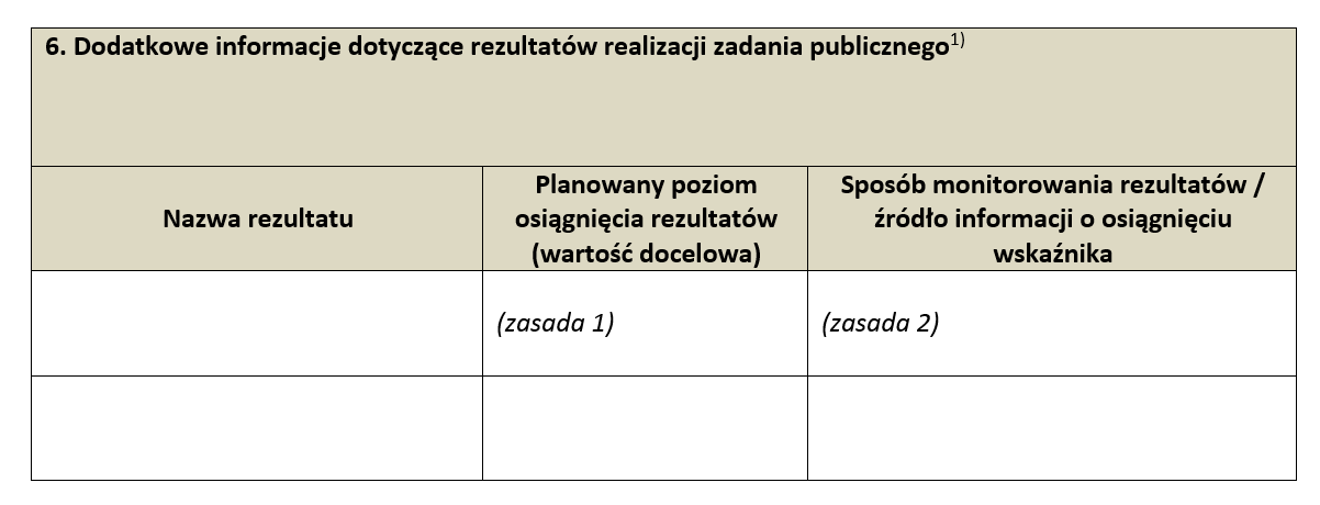 - oczekiwane rezultaty zadania publicznego. Decyzja o ich wprowadzeniu do ogłoszenia powinna wynikać z analizy specyfiki danego zadania. W przypadku zadań, co do których samorząd wie jakie chce konkretnie osiągnąć rezultaty, wpisuje je i traktuje jako obligatoryjne do osiągnięcia,