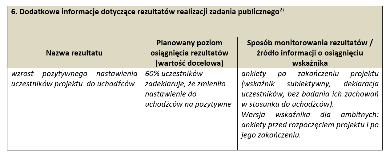 Planowany poziom osiągnięcia (wartość docelowa): 60% uczestników zadeklaruje, że zmieniło nastawienie do uchodźców na pozytywne