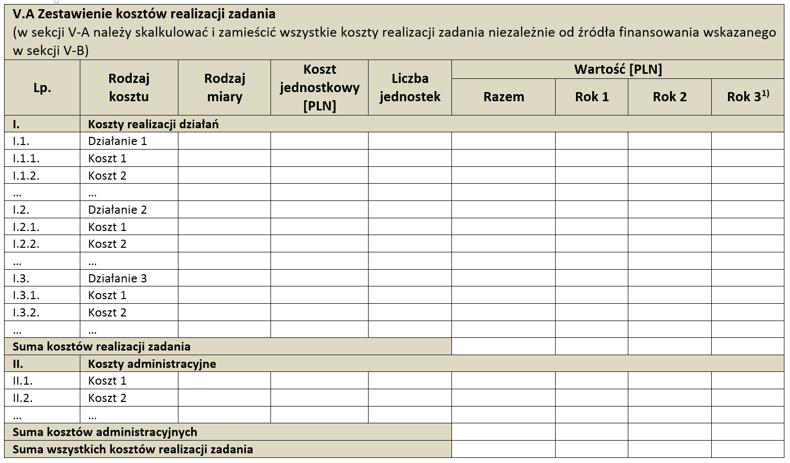 W pierwszej części (V. A), Organizacjo, podajesz tylko koszty zadania w podziale na dwie kategorie budżetowe: