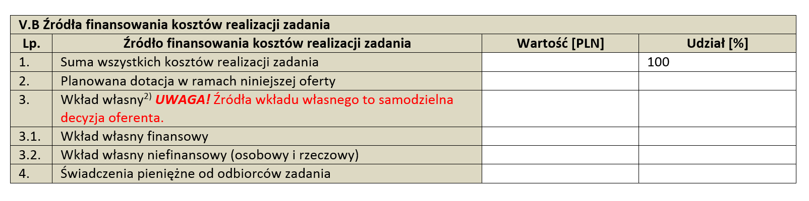 3/ Świadczenia pieniężne od odbiorców zadania (4) – wskazywane jako odrębne od wkładu własnego źródło finansowania kosztów, podczas gdy ewidentnie jest to wkład finansowy do projektu (jeśli organizacja ma działalność odpłatną i prawo do tego, aby odbiorcy partycypowali w koszcie zadania). W związku z tym świadczenia od odbiorców zadania powinny być wskazane w tabeli V.B jako lp. 3.3.