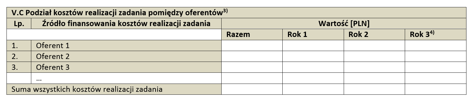 W ostatniej części (V.C), Organizacjo, jesteś pytana o podział kosztów realizacji zadania pomiędzy oferentów - jeśli składasz projekt w partnerstwie, jako oferta wspólna.