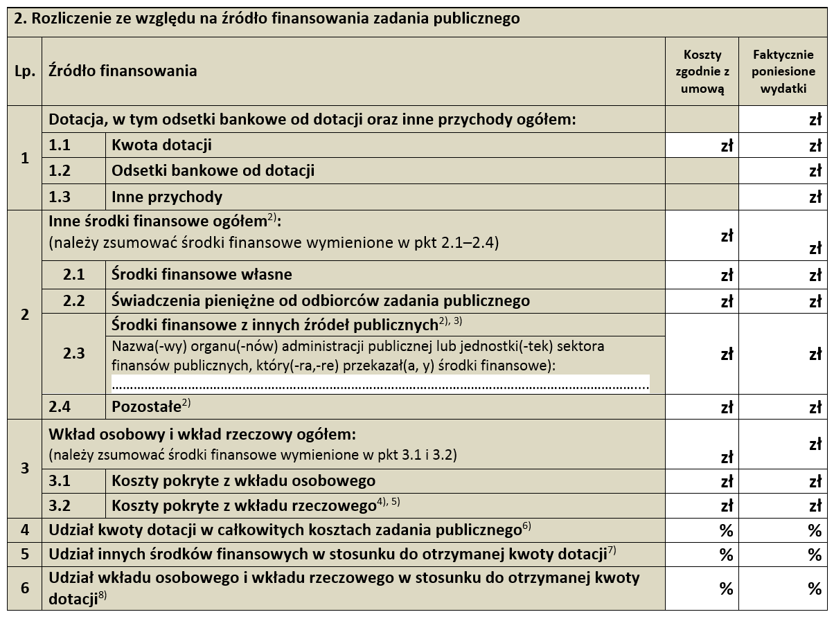 W części finansowej sprawozdania mamy jeszcze punkt 2, związany z rozliczeniem w podziale na źródła finansowania. Tabela pewnie wyda Ci się, Organizacjo, znajoma. Masz rację, w poprzedniej wersji wzorów (przed marcem 2019) był to punkt 9 wniosku o dofinansowanie, kiedy po kosztorysie w punkcie 8 (budżecie projektu) planowaliśmy szczegółowiej, z czego chcemy nasz projekt sfinansować. Chodziło tu o przyjrzenie się różnym możliwościom, które tworzyły wkład finansowy do zadania publicznego. Jest ich aż 4 (patrz Punty 2.1 – 2.4)