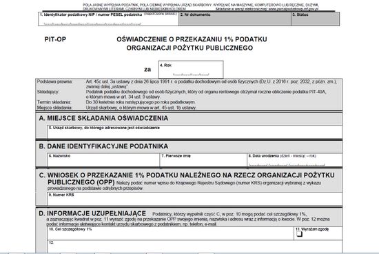 Emeryt nie będzie musiał wyliczać, jaką kwotę stanowi jego 1% (jak robią to inni podatnicy uprawnieni do wspierania OPP). Wystarczy, że wskaże organizację pożytku – poda jej KRS. Rubryki dotyczące przekazania 1% wyglądają w PIT-OP tak samo jak rubryki jednoprocentowe innych PIT-ów umożliwiających dokonanie alokacji, z tym że PIT-OP pozbawiony jest miejsca na wpisanie kwoty.