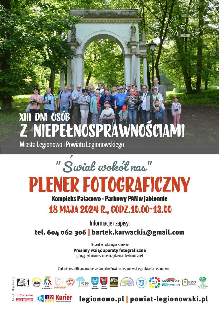 18 maja 2024 roku w malowniczym parku krajobrazowym w Jabłonnie odbył się Integracyjny Plener Fotograficzny „Świat wokół nas” w ramach XIII Dni Osób z Niepełnosprawnościami miasta Legionowo i powiatu legionowskiego. Wydarzenie to po raz kolejny zgromadziło licznych uczestników oraz ich bliskich. Jest kontynuacją dużego projektu służącego aktywizacji i motywowaniu ludzi z dysfunkcjami do otwartego działania na rzecz lokalnej społeczności.