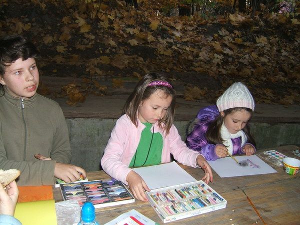 Na terenie Ośrodka Dydaktyczno Naukowego ZPKWŚ po południu swoje wrażenia z całego dnia dzieci przelewały na papier i płótno. Młodsi artyści tworzyli wstępne szkice i rysunki do prac malarskich, jakie będą powstawać w następnych dniach na zajęciach plastycznych w Fundacji. Bardziej pewni swoich możliwości fundacyjni malarze malowali farbami akrylowymi na podobraziach. Walory przyrodnicze tego terenu wywarły duże wrażenie na dzieciach, czego dowodem była wyjątkowość powstałych prac – obrazy pełne radości, szczęścia, ale i takie, które skłaniają do refleksji oraz zadumy. Na zakończenie pleneru odbyła się wystawa prac, omówienie zajęć oraz ognisko z pieczeniem pysznych kiełbasek.