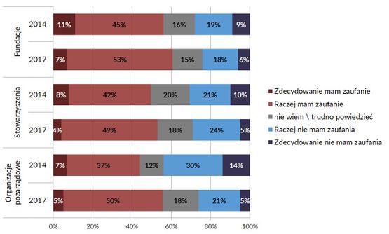 Zanim padły pytania o zaufanie do organizacji, badanie w 2014, jak i w 2017 roku rozpoczęto ogólnym zagadnieniem: „Co to jest organizacja pozarządowa? Z czym się Panu/Pani ten termin kojarzy?”. W 2014 roku 40% Polaków nie umiało odpowiedzieć na to pytanie, nie mając żadnych skojarzeń z hasłem „organizacja pozarządowa”. W 2017 roku ich udział zmniejszył się do 27%. Oznacza to, że 73% naszych rodaków ma jakieś, choćby mgliste, wyobrażenie czym są i jakie działania prowadzą podmioty trzeciego sektora (w 2014 roku było to 60%).