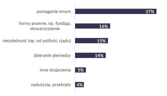 Najczęściej organizacje kojarzą się z pomaganiem – taką asocjację wymienia 37% badanych. 16% na pytanie o organizacje pozarządowe wymienia jakąś konkretną formę prawną, np. fundację lub stowarzyszenie. Podobny procent (15%) uważa, że organizacje definiuje niezależność (np. od rządu), niewiele mniej (14%) kojarzy organizacje pozarządowe ze zbieraniem pieniędzy.
